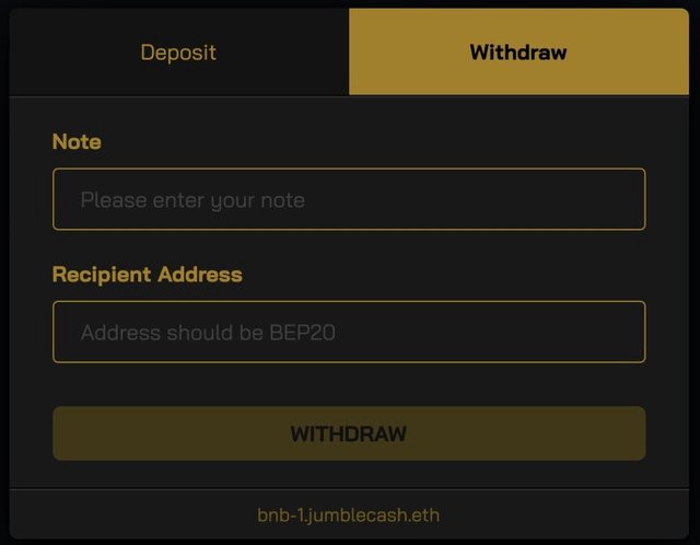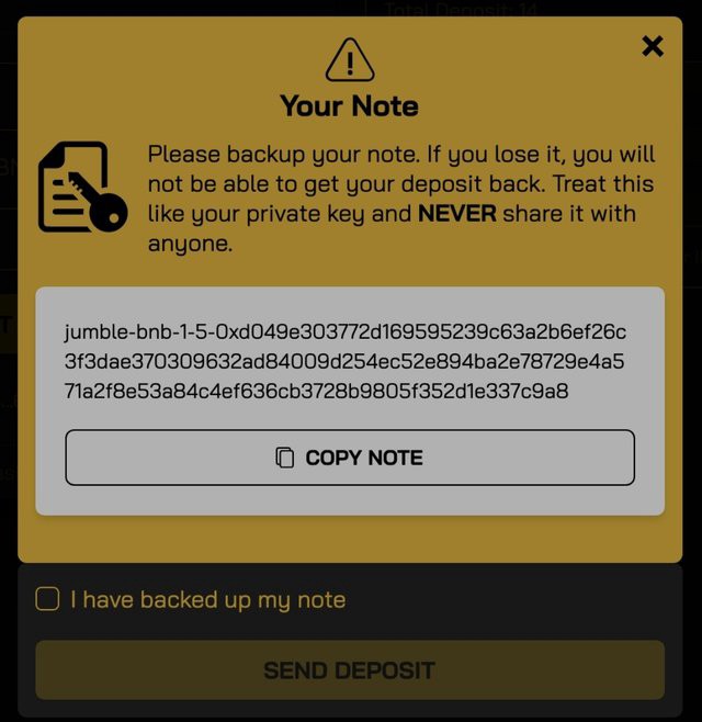 1. Deposit User creates a random key (note) and enters the BNB (BEP20). Open the Jumble Cash app and connect your BEP20 wallet. Then select the group you want to deposit: Jumble Cash currently offers 0.1; one; 10; 100 BNB pools.