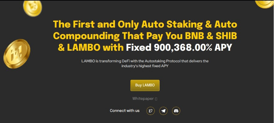 The APY for Lambo Finance is 900,368.31%, which will be paid automatically in LAMBO & BNB & SHIB.